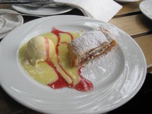 You may wonder why I’m raving about strudel in Budapest when we went from there to Vienna, long hailed as pastry and strudel nirvana, just a couple days later. Well, I did finally order strudel in Vienna on our last day there. I wasn’t officially on a strudel quest or anything, but I tried the cheese strudel at an outdoor cafe near St. Stephen’s Cathedral that was also very good. It actually was like a piece of cheesecake with a little pastry on the top and bottom. Very rich. Good, but not as good as the apple confection in Budapest. Maybe it’s like comparing apples and oranges, though. Apple strudel and cheese strudel. Never the twain shall meet?