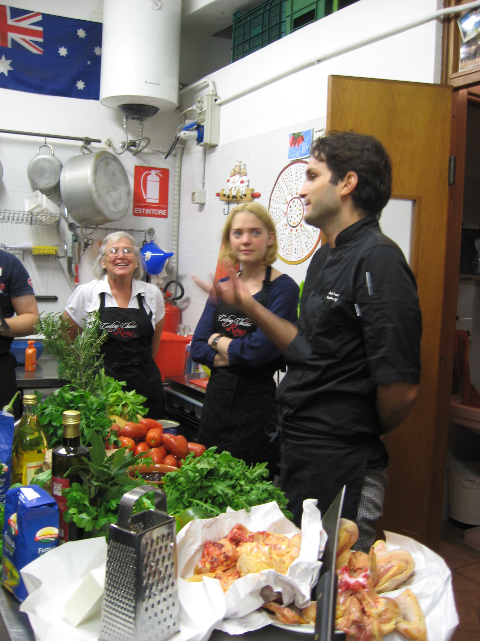 I can only say, it was worth the effort and definitely good value for the cost of the course. I believe there were ten of us in total and together we squeezed into Chef Andrea’s small kitchen and were thoroughly entertained and enlightened by his instruction. We started with a faro salad; faro is a little like barley, I guess, and it was cooked, cooled, then tossed with arugula, tomato, carrots, etc., with an oil and lemon juice dressing. It may not sound that exciting, but it actually was my favorite recipe.